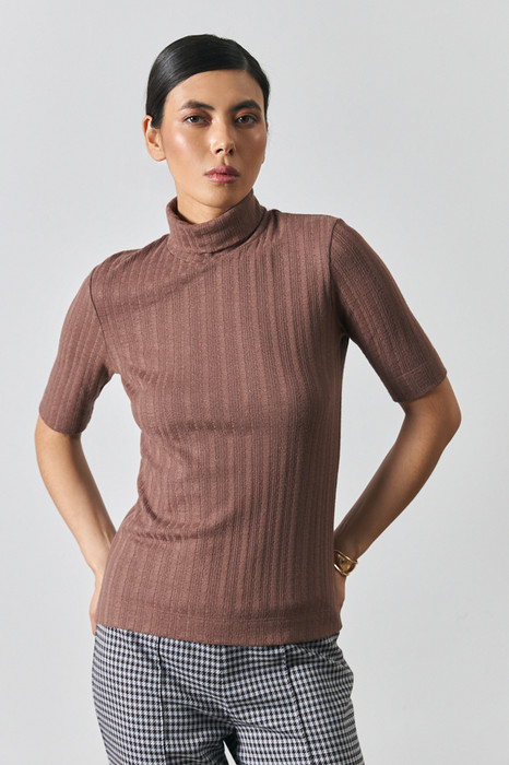 Джемпер прилегающего силуэта из фактурного эластичного полотна. Втачной короткий рукав. Вырез горловины высокая стойка. Джемпер – это хорошая базовая вещь, подходящая для любого гардероба.