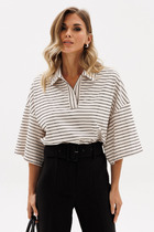 Джемпер прилегающего силуэта из фактурного эластичного полотна. Втачной рукав 3/4. Круглый вырез горловины оформлен бейкой.
