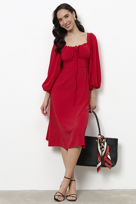 Платье приталенного силуэта, расширенное книзу из ткани с крэш-эффектом. Отрезное по линии талии. Верхняя часть с отрезным лифом, подрез фигурный. По верхнему краю лифа кулиска, в которую вставлены бретели-завязки, формирующие драпировку. Вырез горловины глубокий, расширенный, по форме напоминающий каре, с вырезом до линии подреза. Прилегание платья создано за счет рельефов на деталях переда и вытачек на деталях верхней и нижней части спинки. В верхней части среднего шва спинки застежка на потайную молнию. Рукава втачные, длинные, со сборкой по окату и низу рукава. В подгибку низа рукава вставлена резинка.