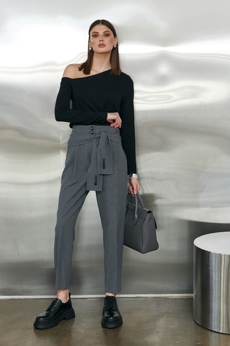 Брюки из костюмной ткани, чуть зауженные книзу. Свободный силуэт с завышенной талией. На передней половинке по линии талии застрочены складки. На задней половинке - талиевые вытачки. Застёжка на молнию-гульфик и пуговицы. В боковых швах декоративные вставки в авангардном стиле.