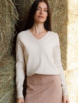 Блуза свободного силуэта из блузочной ткани. Низ изделия асимметричной длины (спинка удлинена относительно переда) с разрезами в боковых швах. Втачной рукав в спущенную пройму. V-образный вырез горловины оформлен косой бейкой из основной ткани.