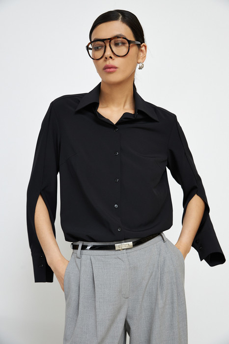 Блуза-рубашка из блузочной ткани. Свободный силуэт с застёжкой на пуговицы. Вырез горловины обработан отложным воротником на стойке. Оригинальный втачной рукав на манжете с застёжкой на пуговицы.