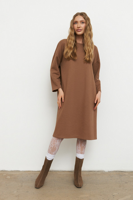 Платье свободного силуэта выполнено из эластичного полотна. Изделие со спущенной линией плеча и длинным рукавом. Вырез горловины оформлен бейкой из основной ткани. В таблице размеров представлены параметры человека, а не изделия.