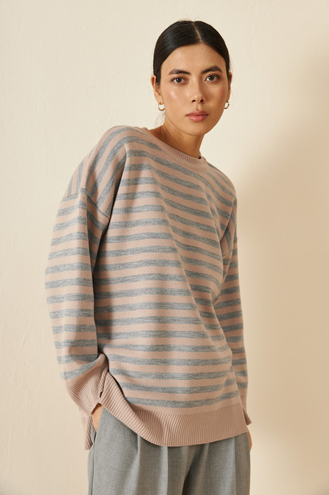 Джемпер очень свободного силуэта со спущенной линией плеча и длинным рукавом. Низ изделия асимметричной длины (спинка удлинена относительно переда) с разрезами по бокам. Круглый вырез горловины, низ изделия и низ рукава оформлены резинкой. Изделие выполнено из мягкой структурированной пряжи.