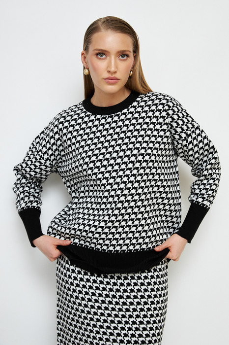 Джемпер свободного силуэта со спущенной линией плеча и длинным рукавом. Круглый вырез горловины оформлен резинкой, низ изделия и низ рукава-высокой резинкой. Изделие выполнено из мягкой структурированной пряжи.