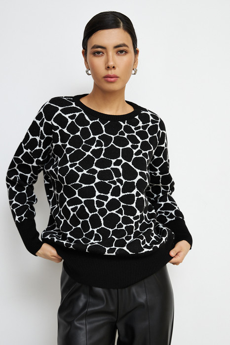 Джемпер свободного силуэта со спущенной линией плеча и длинным рукавом. Круглый вырез горловины оформлен резинкой, низ изделия и низ рукава-высокой резинкой. Изделие выполнено из мягкой структурированной пряжи.