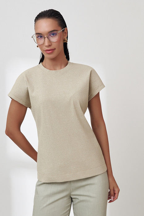 Джемпер свободного силуэта из фактурного эластичного полотна с люрексом. Цельнокроеный короткий рукав. Круглый вырез горловины оформлен бейкой. Женский джемпер стал незаменимой и популярной разновидностью одежды, которая может применяться буквально во всех случаях жизни.