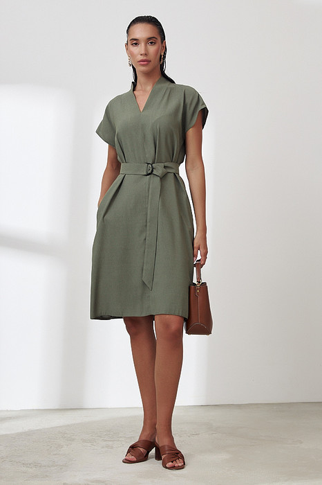 Платье из вискозной ткани с крэш-эффектом. Свободный силуэт с карманами в боковых швах. По центру передней и задней части изделия выполнен шов. Цельнокроеная стойка, переходящая в V-образный вырез горловины, визуально делает фигуру стройнее. Цельнокроеный короткий рукав. В комплекте пояс из основной ткани.