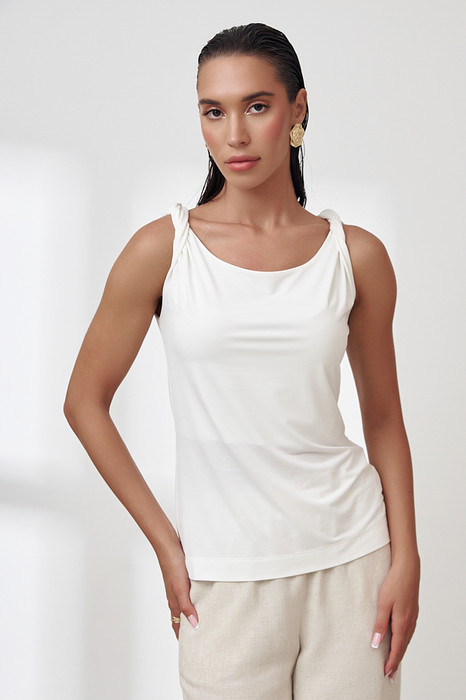 Джемпер полуприлегающего силуэта из вискозного эластичного полотна. Оригинальный крой с перекрутом на плечах. Изделие двухслойное с круглым вырезом горловины.