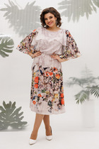 Платье из вискозной ткани с крэш-эффектом свободного силуэта. Изделие отрезное по линии талии с резинкой. Лиф платья с запахом, фиксируется на пуговицу для удобства. На передней части юбки выполнена складка, имитирующая запах, в боковых швах карманы. Линия горловины оформлена воротником-стойкой. Втачной короткий рукав с отворотом. В комплекте пояс из основной ткани.