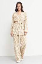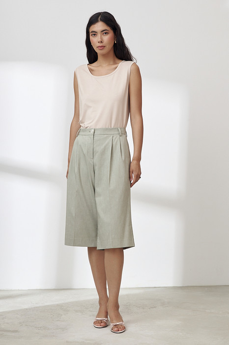 Шорты из меланжевой костюмной ткани свободного силуэта. На передней половинке выполнены карманы с подкройным бочком, по линии талии заложены складки. На задней половинке - талиевые вытачки и имитация карманов в рамку. Притачной пояс со шлёвками. Застёжка на молнию-гульфик и пуговицу.