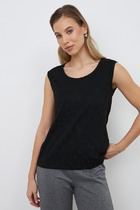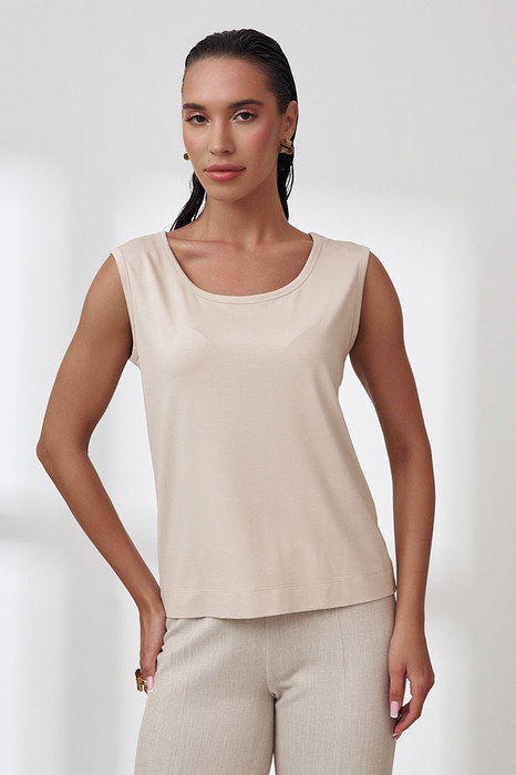 Топ из эластичного полотна полуприлегающего силуэта. Линия горловины и линия проймы окантованы эластичной бейкой.