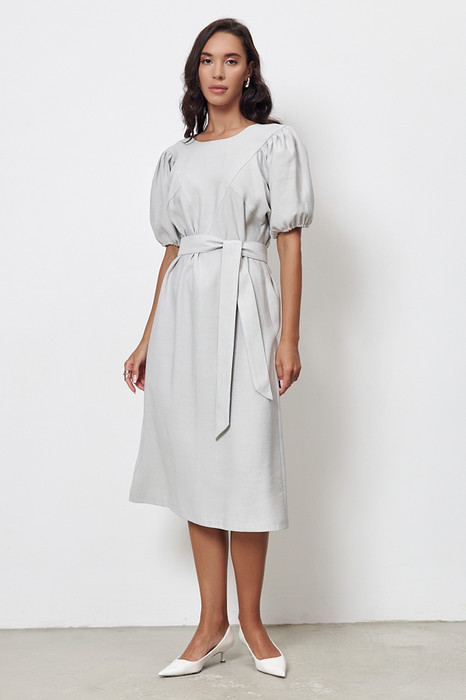Эффектное платье прямого силуэта, чуть расширенное книзу из вискозной ткани с крэш-эффектом. Рукав оригинального кроя, низ рукава присборен на резинку. По переду и спинке изделия выполнена V-образная кокетка со сборкой в области плеча. Круглый вырез горловины, по среднему шву спинки застёжка на петлю-пуговицу. В комплекте пояс из основной ткани.