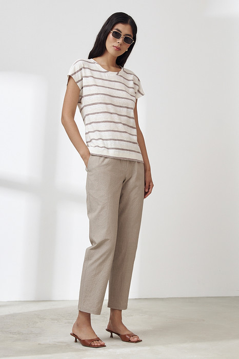 Брюки из фактурной хлопковой ткани, зауженные книзу. В боковых швах выполнены карманы с подкройным бочком. Пояс с эластичной резиной. На передней части брюк имитация гульфика.