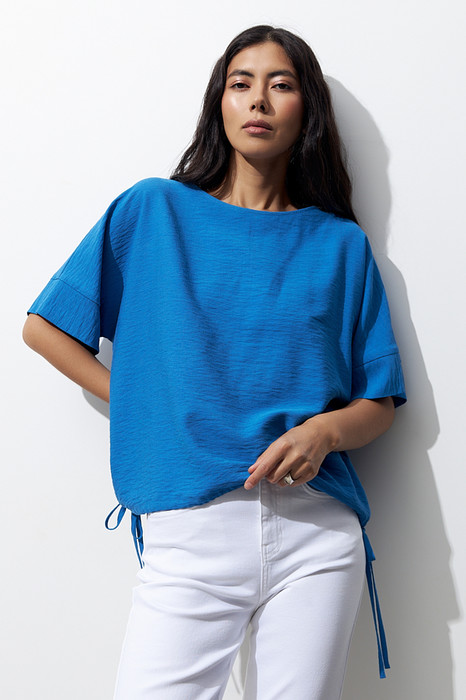 Блуза из вискозной ткани с крэш-эффектом. Очень свободный силуэт с небольшими разрезами по бокам. Круглый вырез горловины. Цельнокроеный рукав с притачной манжетой. Низ изделия затягивается на кулиску.