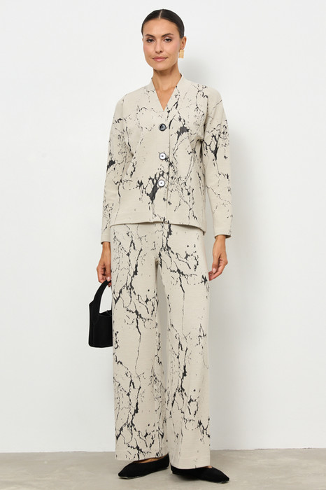 Костюм выполнен из фактурного эластичного полотна. Брюки прямого силуэта. Пояс притачной с эластичной резиной. Кардиган свободного силуэта с притачной планкой и застёжкой на пуговицы. Втачной длинный рукав в спущенную пройму.