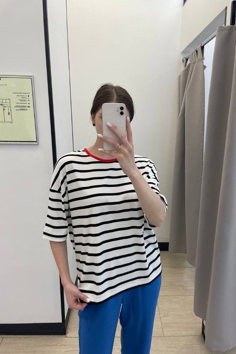 Джемпер из эластичного полотна. Свободный силуэт со спущенной линией плеча и коротким рукавом. Вырез горловины окантован эластичной бейкой. В таблице размеров представлены параметры человека, а не изделия.