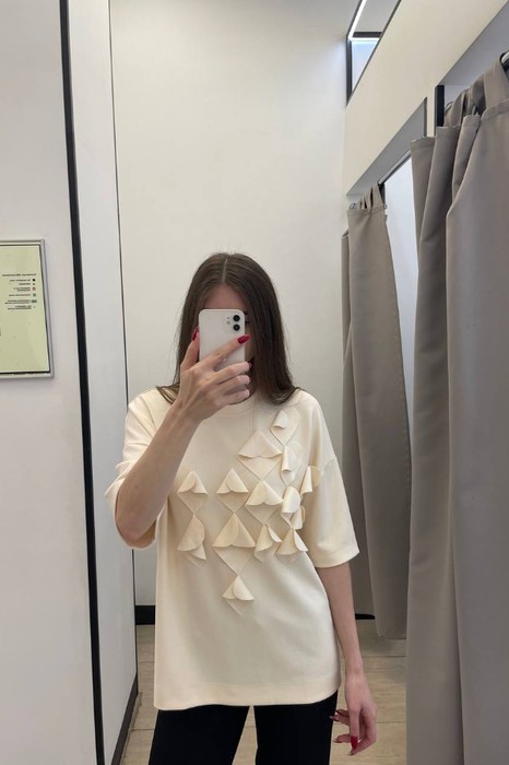 Джемпер свободного силуэта со спущенной линией плеча и рукавом до локтя выполнен из эластичного полотна. Вырез горловины оформлен бейкой из основной ткани. На передней части изделия выполнена аппликация. В таблице размеров представлены параметры человека, а не изделия.