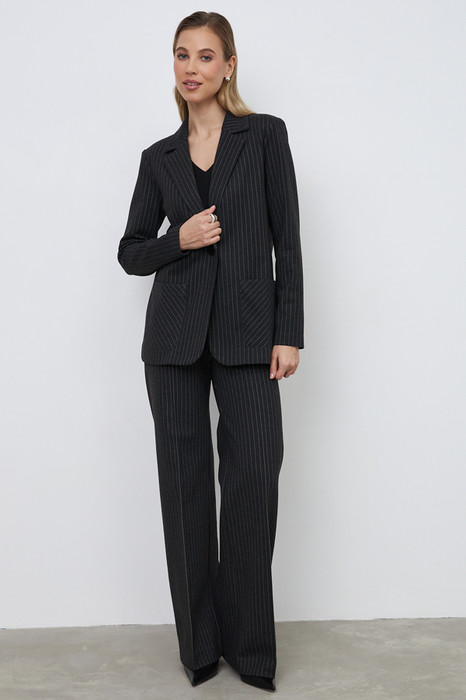 Костюм выполнен из эластичного полотна. Брюки прямого силуэта. На передней части брюк застрочены стрелки. Пояс с эластичной резиной. Жакет прямого силуэта с английским воротником и накладными карманами. На передней части жакета застежка на пуговицу. Втачной длинный рукав. Изделие с плечевыми накладками, которые при желании можно убрать.
