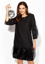 Платье свободного силуэта из плательной ткани. По центру передней части изделия выполнен шов. Цельнокроеная стойка, переходящая в V-образный вырез горловины, визуально делает фигуру стройнее. Втачной длинный рукав с центральным швом и декоративным разрезом по низу рукава. В комплекте пояс из основной ткани.
