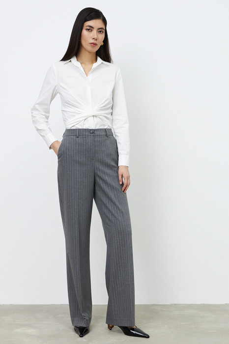 Брюки из костюмной ткани прямого силуэта. Застёжка на молнию-гульфик и пуговицу. В боковых швах выполнены карманы с подкройным бочком. Притачной пояс со шлёвками. На задней половинке брюк карманы в рамку с пуговицей, на поясе вставка с резиной.