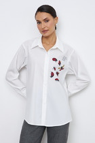Блуза из вискозной ткани свободного силуэта. Низ изделия асимметричной длины (спинка удлинена относительно переда) с разрезами в боковых швах. Втачной рукав в спущенную пройму. Круглый вырез горловины оформлен косой бейкой из основной ткани.