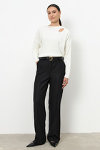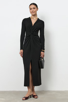 Платье из эластичного полотна прилегающего силуэта. Оригинальный крой с перекрутом на передней части изделия, снизу разрез. Глубокий V-образный вырез горловины. Втачной длинный рукав.