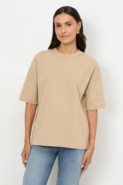 Джемпер из эластичного полотна. Свободный силуэт со спущенной линией плеча и рукавом до локтя. Вырез горловины оформлен бейкой. В таблице размеров представлены параметры человека, а не изделия.