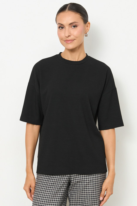 Джемпер из фактурного эластичного полотна. Свободный силуэт со спущенной линией плеча и коротким рукавом. Вырез горловины оформлен бейкой. В таблице размеров представлены параметры человека, а не изделия.