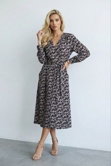 Платье из вискозной ткани свободного силуэта с притачным поясом к талиевым вытачкам. Изделие отрезное по линии талии, на которой заложены защипы. На передней и задней части изделия выполнена двойная кокетка со сборкой. По центру передней части застёжка на пуговицы, в боковых швах карманы. V-образный вырез горловины, визуально делает фигуру стройнее. Втачной длинный рукав на манжете с застёжкой на пуговицы.