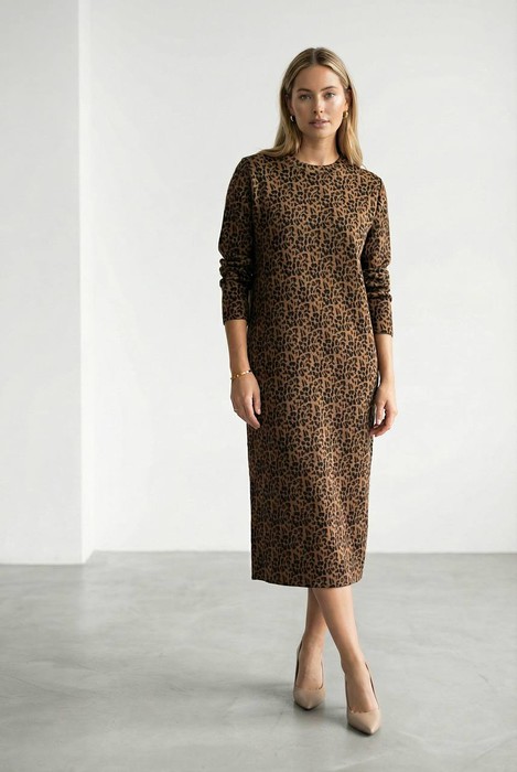 Платье полуприлегающего силуэта из эластичного полотна. Круглый вырез горловины оформлен притачной бейкой. Втачной длинный рукав.