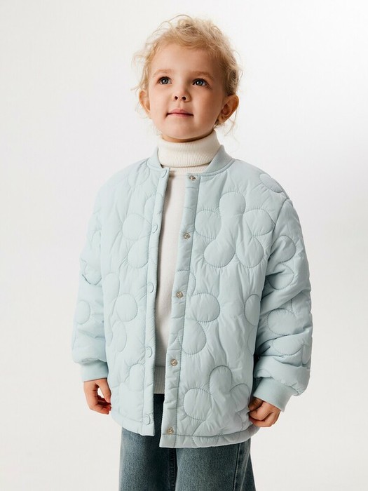 Утепленная стеганая куртка-бомбер для девочки изготовлена из ткани с водоотталкивающей пропиткой, которой не страшны мелкий дождь, туман и сырость. Ткань верха простегана с утеплителем декоративной стёжкой в виде цветочков, что придает модели визуального интереса. Утеплитель - синтепон (вес 180гр/м2 и +15 гр на каждый размер). Рекомендованный температурный режим от 0 до +15 градусов. Куртка с центральной застежкой на кнопки делает одевание быстрым и легким. В боковых швах расположены два кармана, в которых удобно хранить полезные мелочи и греть руки. Низ рукавов с трикотажными манжетами для лучшего прилегания к телу и сохранения тепла. Из этого же трикотажного полотна выполнен воротник бомбера.