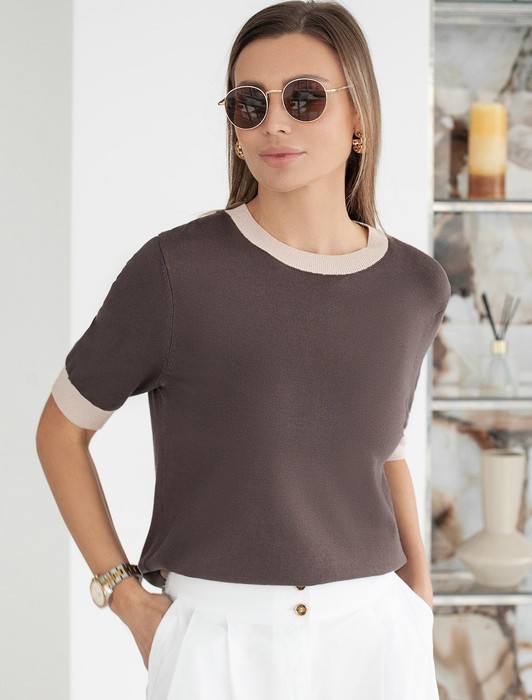 Состав: 80%Вис 20%ПАЛегкий джемпер кофейного цвета с круглым вырезом идеально подходит на весну и лето. Тонкая вязка из вискозы дарит приятный комфорт и ощущение свежести в теплую погоду. Полуприлегающий крой подчеркивает силуэт, а универсальная длина позволяет сочетать джемпер с разными элементами гардероба. Контрастная отделка с мягким люрексом добавляет стильный акцент, создавая выразительный образ. Деликатное мерцание придает праздничное настроение, но не выглядит слишком ярко или вызывающе. Такой элемент украшения позволяет носить нарядный джемпер и на особых мероприятиях. Джемпер отлично смотрится на больших размерах благодаря продуманному крою и полуприлегающему фасону. Этот джемпер с коротким рукавом станет незаменимой частью гардероба в сезоны, когда хочется легкости и элегантности одновременно. Лаконичный дизайн обеспечивает простоту комбинирования с другими вещами и будет универсальной базой для создания разнообразных комплектов — от офисного до непринужденного городского стиля.