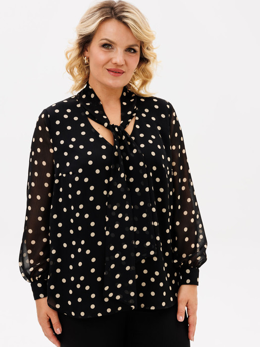 Нарядная лаконичная женская блузка прямого кроя из шифоновой ткани в романтический горох. Блузка имеет завязки на горловине и длинный рукав на манжете. Блузка на подкладке. Сочетайте с брюками , юбками. Хороший вариант для прогулок и на работу.
