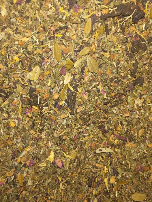 Каркадэ, сушеное яблоко, листья мяты, смородины и клубники, лепестки календулы, аромамасла, лепестки чайной розы
