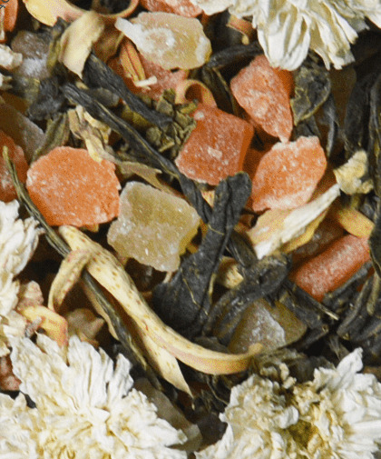 СОСТАВ: Купаж на основе зеленого традиционного китайского чая с добавлением цветков хризантемы, цукатов, цветков апельсинового дерева. Содержит пищевые ароматические масла.
