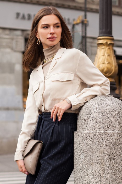 Состав: 100%ВисБлузка из премиальной вискозы в рубчик в стиле "сафари". Важный акцент эфффектные контрастные отделочные строчки, подчеркивающие этот стиль. Золотистые пуговицы являются ярким акцентом на классическом для стиля "сафари" бежевом цвете изделия