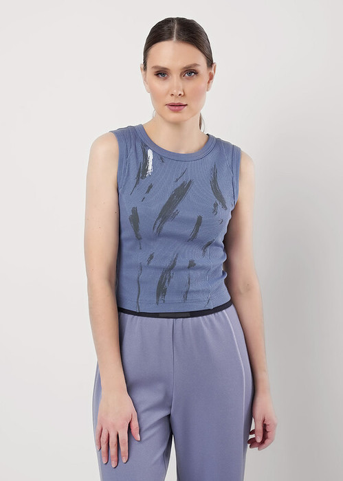 Майка из хлопкового трикотажного полотна кашкорсе. Умеренный объем,среднее плечо. Округлая горловина, по горловине и пройме окантовка. По переду и верху спинки отстроченные резы. Спереди принт.