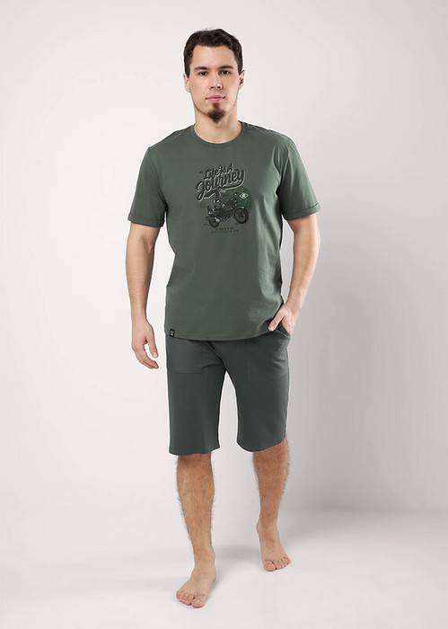 Комплект мужской для дома состоящий из футболки и шорт. Футболка из трикотажного полотна с круглым вырезом горловины, коротким рукавом и стильным принтом. Шорты из трикотажного полотна на эластичном поясе с функциональными карманами и шнуром.