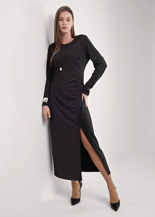 Платье полуприлегающего силуэта из трикотажного полотна с блеском. Округлая горловина. Длинный втачной рукав, по низу рукава разрезы. По переду рельеф со сборкой на резинку и разрезом. По спинке средний шов с застёжкой на молнию.