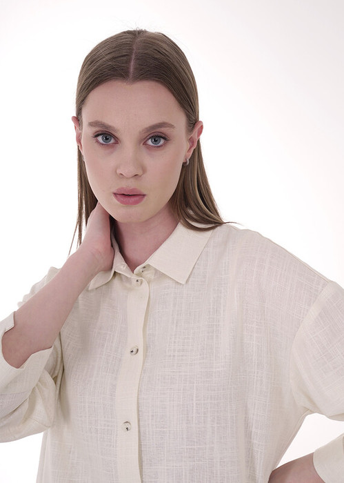 Блузка из текстильного полотна лен с вискозой,прямого силуэта. Длинный рукав со спущенной линией плеча, по низу манжет с разрезом. По борту цельновыкроенная планка с застежкой на пуговицы, по горловине отложной воротник со стойкой. По бокам разрезы.