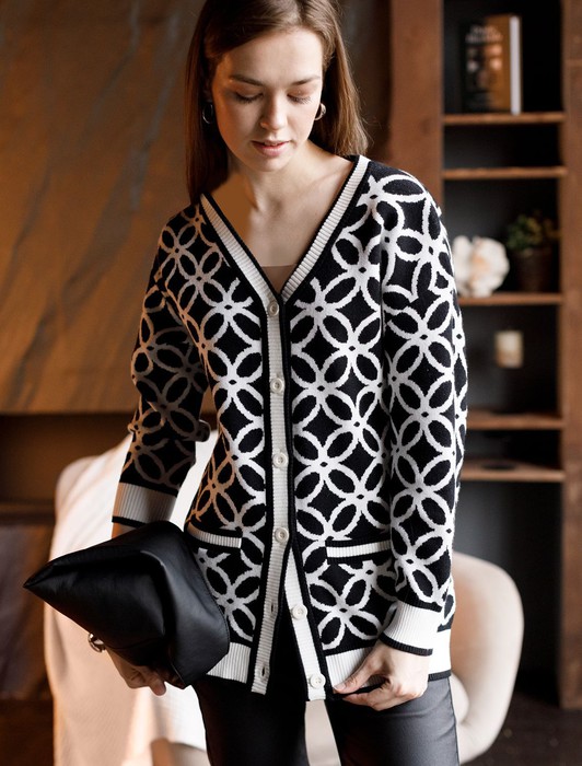 Состав: 50%Вис 20%ПА 20%ПЭ 10%Кашемир Параметры модели на первом фото: Рост 170, бюст 89, талия 63, бедра 92Кардиган жаккардовой вязки выполнен из нежной пряжи на основе вискозы с добавлением кашемира. Мягкая модель не раздражает кожу, приятно ощущается на теле и поддерживает комфортный микроклимат. Совет стилиста: модель гармонично впишется в любой гардероб, добавив образу выразительности. Сочетайте с однотонными брюками, юбкой, платьем или джинсами