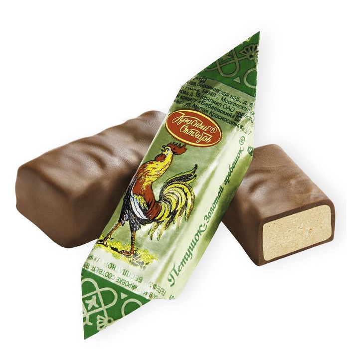 Нарядные праздничные конфеты «Петушок Золотой Гребешок» от фабрики «Красный Октябрь». Плотное светлое пралине с пряным апельсиновым ароматом, покрытое слоем темной шоколадной глазури. Многогранный вкус нежного пралине изысканно сочетается с терпковатым вкусом шоколадной глазури. Конфеты хороши как с чаем, так и с кофе.
