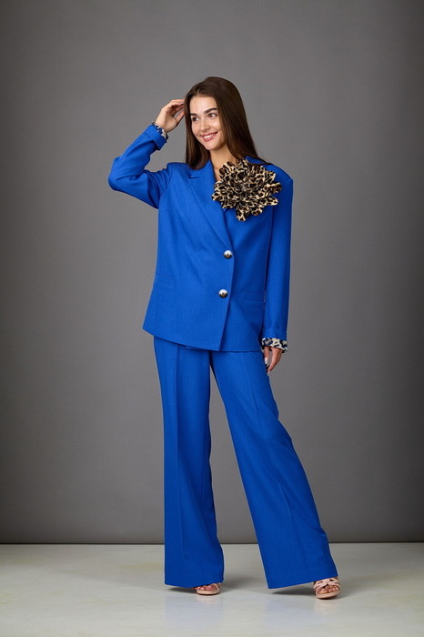 Двубортный жакет прямого силуэта с вытачками по переду. Карманы с листочками. Воротник - пиджачного типа. В среднем шве спинки - планка, застегивающаяся на пуговицы. Рукава - втачные, двухшовные. Застежка на 2 пуговицы и одну потайную. Цветок-брошь входит в комплект. Широкие брюки с поясом и карманами. По бокам пояса-резинка.Застегиваются по переду на молнию и пуговицу.