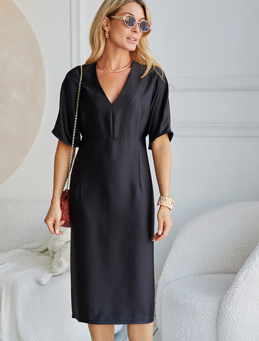 Состав: 69%ПЭ 23%Вис 8%Лиоцелл (Вис) Параметры модели на первом фото: Рост 172, бюст 88, талия 64, бедра 88Платье с глубоким V-вырезом и рукавом «летучая мышь» выполнено из тончайших нитей плотного сатина, плетение которых создает полуматовый блеск, напоминающий натуральный шёлк. Модель с длинными глубокими вытачками спереди и сзади выглядит скульптурно, но за счет струящейся ткани сохраняется плавность силуэта. Ткань почти не мнется и имеет легкий вес. Комфортная длина ниже колена и застежка на молнию.
