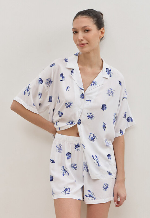 Пижама из тканой вискозы в мелкий принт ракушки, кораллы, крабики и лобстеры. Рубашка с отложным английским воротником, на пуговицах. Рукав короткий. Шорты короткие , свободные на резинке.