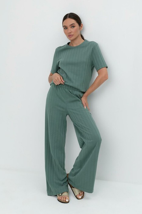 Свободные женские брюки из плотного гладкого трикотажа интерлок в рубчик. Низ обработан плоскими швами.