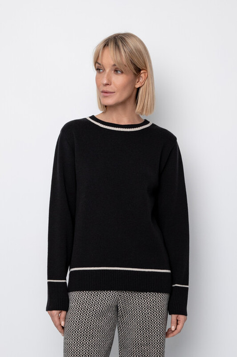 Базовый джемпер с объемными рукавами и лаконичным круглым вырезом. Манжеты, украшенные декоративными пуговицами и нижний край изделия вывязаны широкой резинкой, благодаря которой края не растягиваются.