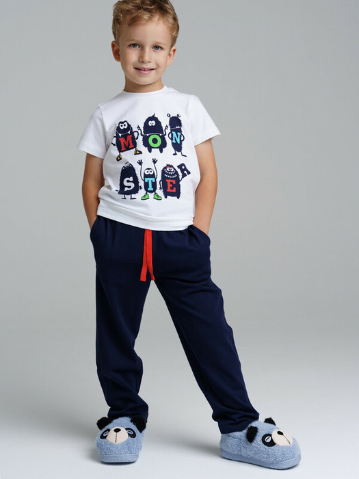 Пижама: футболка и брюки из эластичного и приятного на ощупь трикотажа. На брюках эластичный пояс со шнурком. Высокое содержание хлопка 95%. Благодаря наличию эластана в составе ткани изделие держит форму и меньше мнется.