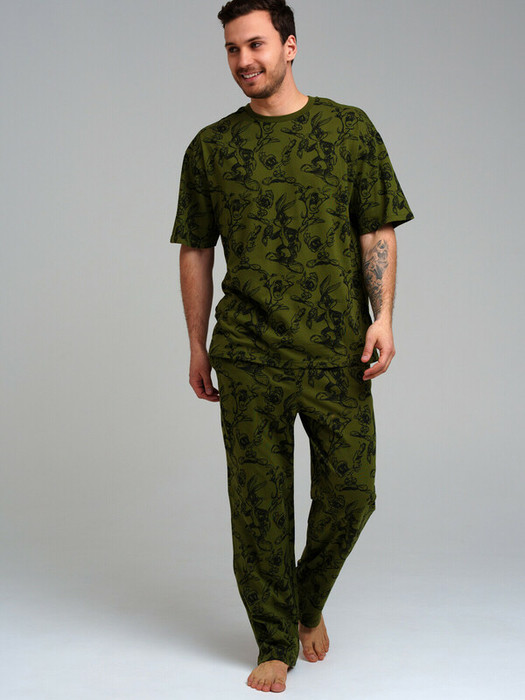 Пижама из качественного и приятного на ощупь трикотажа джерси. 100% хлопок. Футболка силуэта oversize. Брюки comfort fit - свободный крой. Эластичный пояс со шнурком. Карманы в боковых швах.